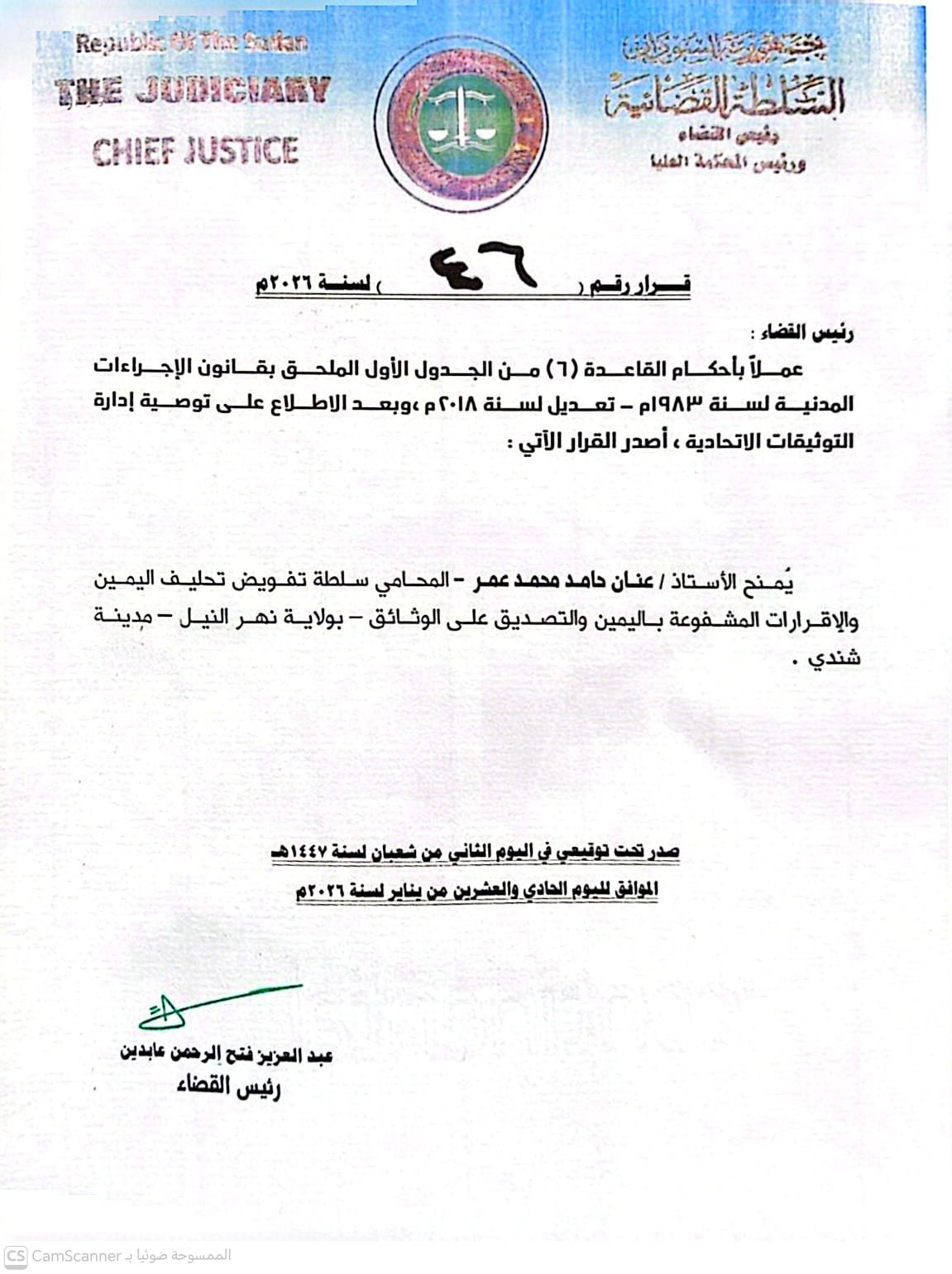تداول مدونون بمواقع التواصل الاجتماعي قرار صادر عن رئيس القضاء، يقضي بمنح مدير الشرطة السابق الفريق عنان حامد عمر، وزير الداخلية المكلف وقتها رخصة ممارسة المحاماة والتوثيق، بولاية نهر النيل،