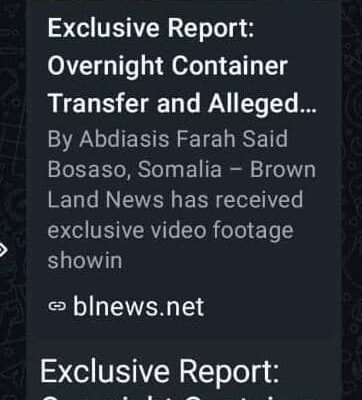 حصري وعاجل عبدالعزيز فرح سعيد مراسل براون لاند / مقديشو مواصة لتتبع السفينة( سوقطرة ٣ ) تحصلت براون لاند علي لقطات فيديو حصرية تظهر 20 حاوية تم نقلها في حوالي الساعة 3: 30 صباحا من قاعدة تديرها الإمارات العربية المتحدة في بوصاصو إلى ميناء بوصاصو ومن المتوقع أن يتم تحميل الحاويات على سفينة الشحن سقطرة […]